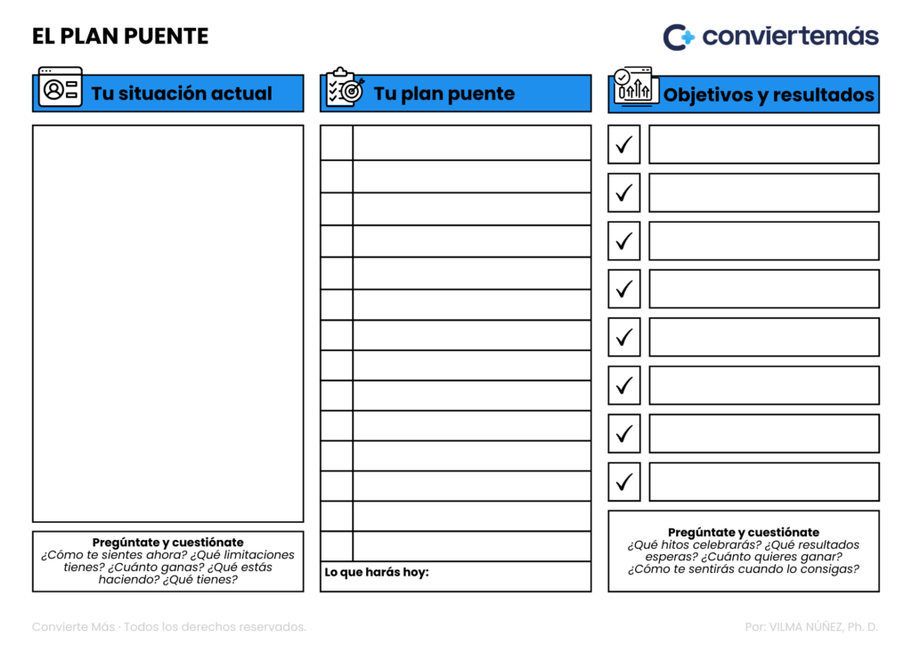 Cualquiera puede soñar, pero pocos pueden planificar, trazar, seguir y cumplir un plan. Aquí es donde te presentamos el plan puente, que es una creación de nuestra fundadora Vilma. Ella sabe muy bien lo que es tener una idea y llevarla al plano real, a través del Plan Puente.